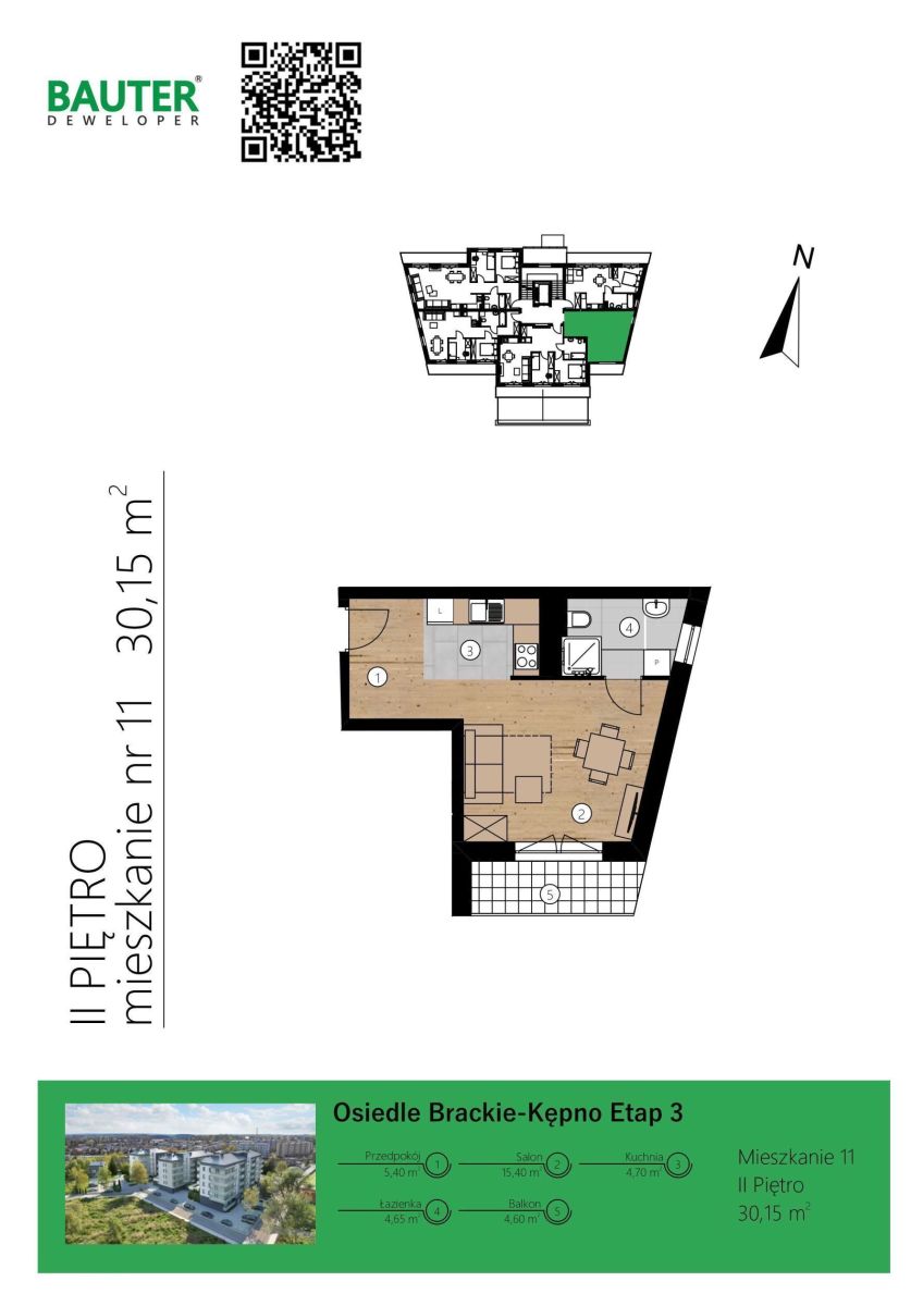 Mieszkanie nr 11. Powierzchnia: 30,15m2 . Położone na 2 piętrze.