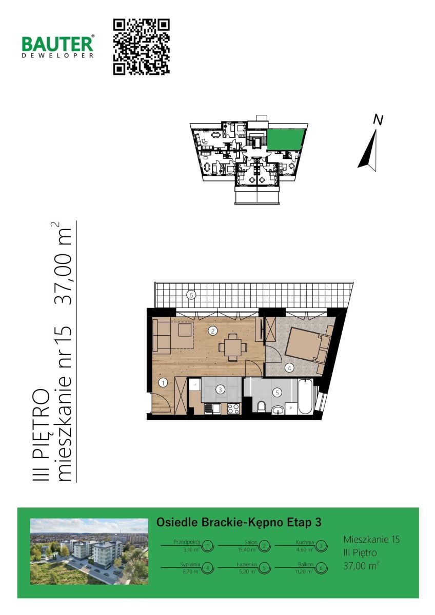 Mieszkanie nr 15. Powierzchnia: 37,00m2 . Położone na 3 piętrze.